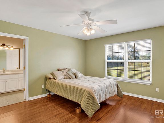 Welcome to Southern Charm in Foley! Discover an inviting sanctuary nestled in the cul-de-sac on a quiet loop in the desirable East View subdivision with no rear neighbors. This elegant home blends timeless character with modern ease, offering the perfect setting for both everyday living and entertaining. The thoughtful front porch façade invites you in—and the expansive half-acre lot provides a serene and private outdoor space ideal for gatherings, children or pets. Enjoy relaxing on the covered back porch watching the cows graze in the pasture behind the home. Inside bright windows in main living areas and generous room proportions bring a sense of openness and air flow, and the oversized master suite provides a comfortable retreat. Floors are wood laminate and tile, no carpet. 3 large bedrooms and 2 full bathrooms in a convenient split bedroom floor plan. The master suite is spacious with an en suite bathroom and a large walk-in closet. The expansive backyard is fully fenced and has room for a pool and includes a storage shed. Fortified Roof installed in 2024, new water heater in 2025. Kitchen appliances were replaced in 2020. All appliances convey. East View subdivision is in a prime rural location: only minutes away from Foley’s conveniences—shopping, dining, entertainment, beaches—yet tucked into a peaceful, low traffic setting in South Baldwin County. The neighborhood is quaint without the typical cookie-cutter look on small lots. Buyer to verify all information during due diligence.