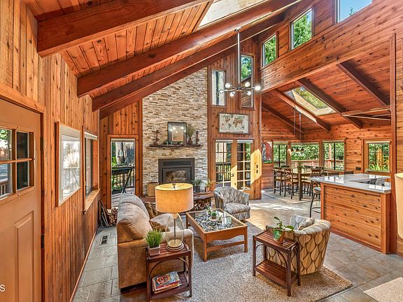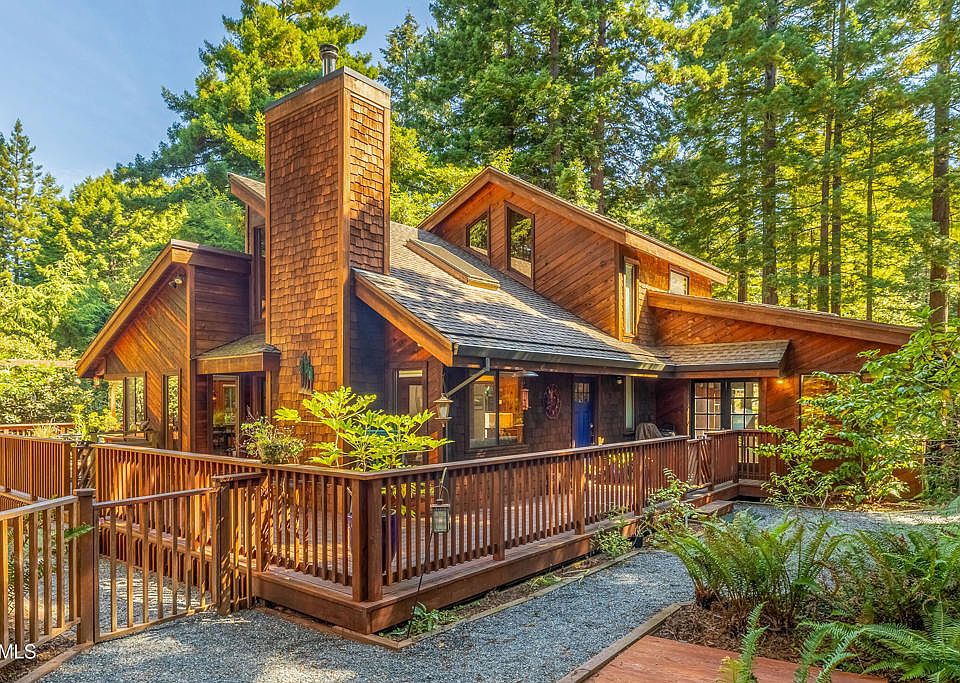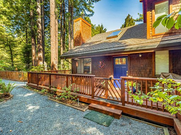 Nestled in the heart of Mendocino County, this enchanting 4-bedroom, 3-bathroom home combines woodland charm with modern comforts and two primary suites. Surrounded by towering redwoods. The beautifully remodeled kitchen features custom-crafted cabinets, a suite of new Viking stainless steel appliances, and custom lighting that enhances the space. A unique built-in pop-up TV lift in the kitchen offers convenient viewing from both the kitchen and living room.Step outside to an inviting, expansive deck that wraps around the home, perfect for enjoying morning coffee or evening sunsets with friends. Skylights throughout the home flood the space with natural light, including two tube skylights that brighten the hallway. A detached bonus room, currently used as a yoga studio, offers versatility for your lifestyle.The property includes an ADU with a full eat-in kitchen, bathroom with heated floors, abundant storage, and a hot tub for relaxation. The enclosed catio with a pet door is ideal for animal lovers. Additional amenities include a 2400-gallon water tower, back-up generator, dual furnaces, and ample parking, with space for up to 4 vehicles. Backing to Jackson State Forest, enjoy direct access to hiking trails and serene woodland views. This home is a perfect blend of nature and modern luxury.