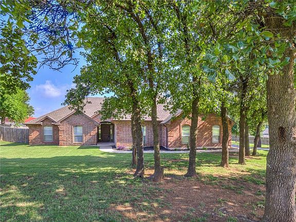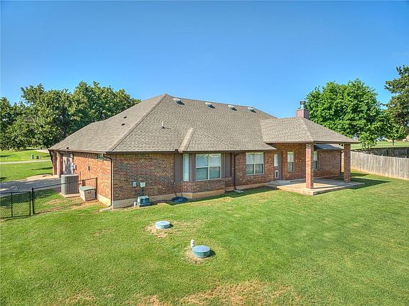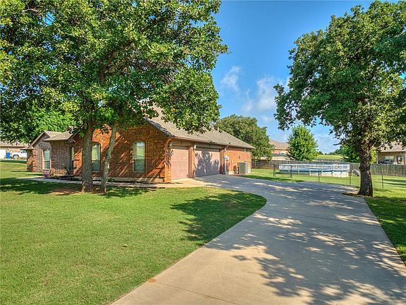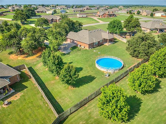 This stunning four-bedroom home in the desirable Triple Crown Meadow neighborhood has everything you have been dreaming of. From the moment you arrive, you will notice the cul-de-sac lot, the large .77 acre yard with salt-water above ground pool, and the three-car garage featuring a storm shelter. Step inside to discover an exceptional layout, with spacious main living area with beautiful wood burning fireplace, and a bonus flex room that can be used for a study, formal dining, living, theater, or game room. Enjoy cooking in the open kitchen, equipped with stainless steel appliances, granite countertops, corner pantry, breakfast bar and tons of cabinet and counterspace. The Primary suite is a private retreat, with bay window overlooking the backyard, ceiling fan, and luxurious en-suite bathroom featuring a jetted tub, double vanity, walk in shower, and large master closet. All of the bedrooms are large with ceiling fans. There is also a spacious covered patio ideal for entertaining guests. Enjoy the peace and quiet of country living with easy access to I-35 and just 32 minutes to downtown OKC. Recent upgrades include newer water softener, extra insulation, 220v electrical outlet, extra lighting and outlets in the garage and new indoor paint, plus, seller is leaving the video projector in the flex room. Fiber powered internet and OGE electric. Make this your dream come true today!