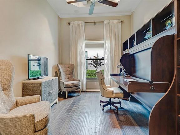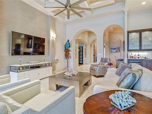 Look across the water to a sandy beach, palm trees, and unobstructed sunsets --this house has it all. There is a water view, pool, deeded boat dock, and a spectacular view. The house boasts three bedrooms plus a den complete with Murphy Bed (which stays). A spectacular outdoor kitchen and entertainment area to enjoy the view and pool. A deluxe sound system pipes music to all rooms. There is an open concept kitchen and living area. The master has access to the lanai and boasts a spacious bathroom. The house comes complete with a deeded boat dock to allow access to the Miromar's 600-acre recreational lake. Built by the prestigious Harbourside Custom Homes, this Villa Roma model has crown molding, tile floors, granite countertops, and a spacious floor plan. Miromar Lakes Beach & Golf Club offers a resort lifestyle with a 39000 square foot Beach Club and Beach grill. Miromar Lakes also has a spa with a salon, fitness center, restaurant, and aerobics studio. There is a community 10,000 square foot, zero-edge infinity pool. This spectacular home is close to shopping, airport, Florida Gulf Coast University.