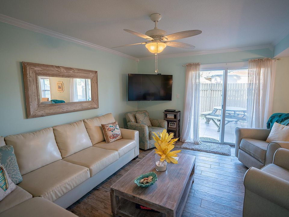 CURRENTLY UNDER CONTRACT. SELLER IS ACCEPTING BACKUP OFFERS'. This fully renovated and upgraded condo located in Horizon South is a must see!! Horizon South is a gated community on the West end of Panama City Beach with numerous amenities and deeded access to the beach. Enter the foyer on to a beautiful custom design mosaic tile floor. The charming kitchen, den/dining and all bedrooms have wood look ceramic tile floors and crown molding. cabinets with breakfast bar. Exit the den through upgraded sliding glass doors on to a private tiled patio with privacy fence. Located also on the ground floor is a laundry room, half-bath and inside under the stairs storage closet.