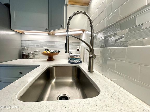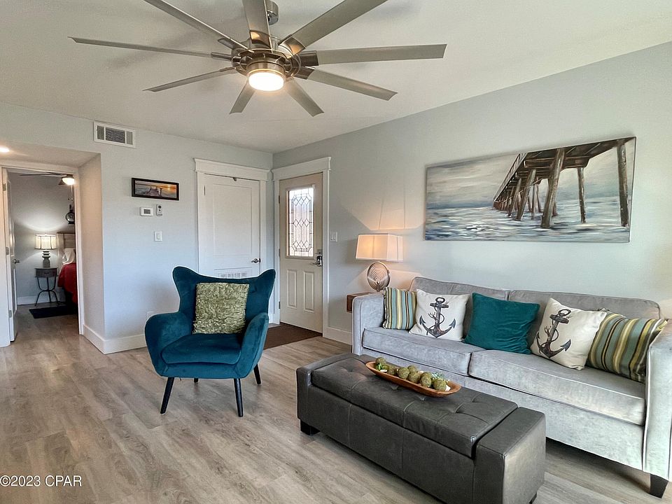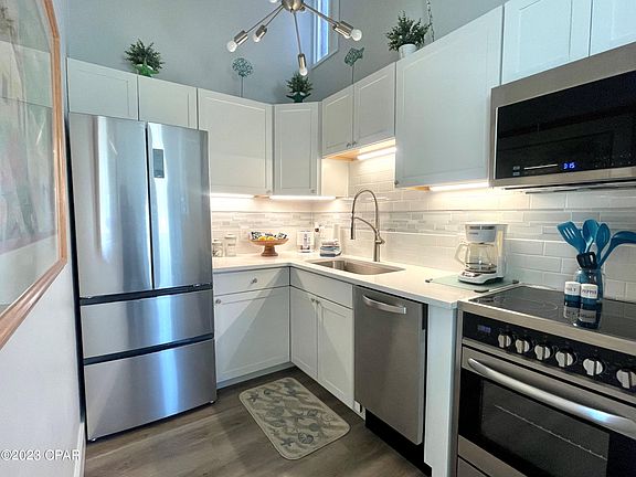 You'll love this incredibly renovated, ground floor condo with private enclosed patio! Located on a green space, this non-rental second-home is just steps from resort amenities and a short stroll to dedicated beach access right across the street. Everything is NEW including roof, plank flooring, appliances, w/d, furniture, fixtures, panel doors and paint. Kitchen is a gorgeous WOW factor!! Look at the NEW bathroom with skylight. Furnished and rental ready with good income potential. This well-run resort is golf cart and pet friendly for owners. Enjoy community pools, hot tubs, tennis, pickleball, shuffleboard, grilling area, club house, billiards room, gym. Lots for the children including mini-golf, kiddie pool, playground and basketball. Convenient to groceries, dining and Pier Park.