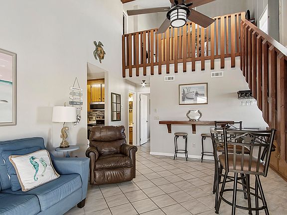 Beautiful Loft 2 Bedroom 2 Bath Unit in the ever popular Horizon South Community! This unit features beautifully stained woodwork that perfectly contrasts and flows with the tile and features throughout. The kitchen features Stainless Steel Appliances with white countertops, and a beautiful mosaic tile backsplash. The upstairs master bedroom loft area boasts carpet and overlooks the downstairs living area. Outside is a large, fenced in open air patio area that is perfect for relaxing and taking in the salt air. Schedule your showing on this unit asap, because this one will move fast!