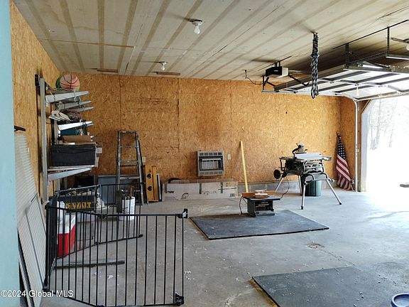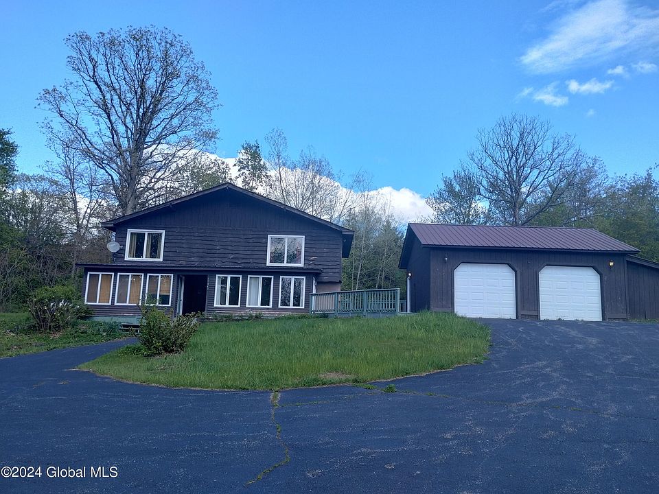 Beautifully renovated Adirondack styled home on 12+wooded acres. Downstairs offers open floor plan (living, dining, kitchen). Updated flooring, renovated staircase, wood stove, renovated bath with marble vanity and large extra room for a four bedroom or entertainment space. Kitchen has been updated and offers plenty of storage space. Mechanical room in the rear with furnace, breaker box, and water heater all on the main level. Second level offers a large foyer, contemporary styled open 3rd bedroom, primary bedroom with en-suite bath (offering a large soaking tub, shower and laundry closet). Second bedroom and through the hallway a large walk in closet. Large Deck with access to a separate room formerly used as a home business. Spacious 2 car garage, and storage building in the back yard.
