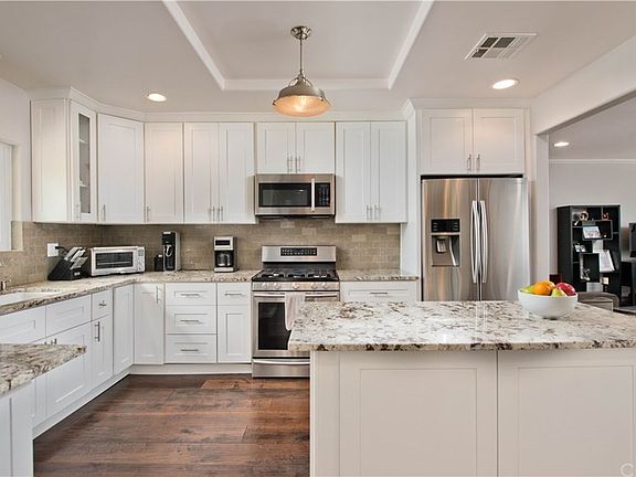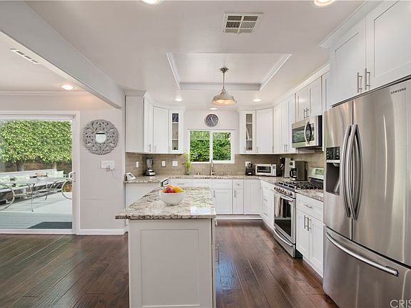 Exquisite Encino Home tastefully upgraded with high end finishes throughout. As you arrive, you are immediately welcomed by the lush landscaping and inviting front porch. Enter into the open floor plan boasting hardwood floors, crown molding, recessed lighting, and plenty of natural light. Gourmet Kitchen with white shaker cabinetry, granite counter tops, spacious island, stainless steel appliances and large pantry. Formal dining space overlooking the lush backyard with slider to outdoor deck. Large master suite with high ceilings, sliders to backyard deck and master bathroom complete with jetted tub, stall shower, and dual vanity. Two additional spacious bedrooms down stairs with built in closet systems and remodeled hall bathroom. Upstairs offers a large guest suite or office space with built ins, remodeled bathroom, and balcony overlooking the backyard. Finished garage with side by side laundry. The backyard offers a little slice of paradise with a large wood deck, lush landscaping, privacy hedges, Spa, decomposed granite pathways and turf grass area. The owner has spared no expense with remodeling, new windows, paint, flooring, landscaping, solar panels, and so much more. This home shows pride of ownership at every turn!