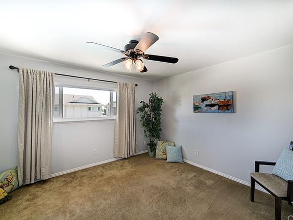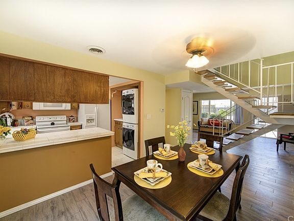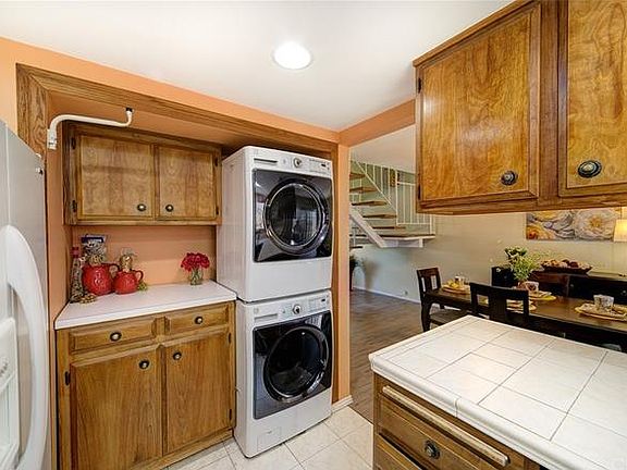 This is a 1200 sq ft townhouse with 3 bedrooms upstairs and 1.5 baths. One shared full bath upstairs and half bath downstairs. One parking permit available. One garage parking is available for an additional $100. The unit includes stove, microwave, refrigerator, and washer and dryer unit. Association includes two pools and one playground. Furniture shown in photos are not included. There is central heating. Central cooling is not available. Disclosure: Property is a shared unit. The separate unit above garage has a tenant currently living in it.
