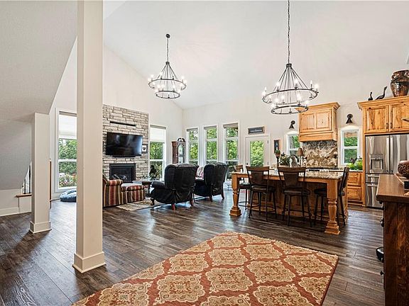The heart of this home is the expansive kitchen, boasting a huge island with granite countertops, a gas stove, and a butler's pantry with ample cabinet space. It's perfect for both everyday living and entertaining. The living room impresses with its vaulted ceilings and cozy fireplace, creating a warm and inviting atmosphere. A convenient laundry room is also located on the main level.