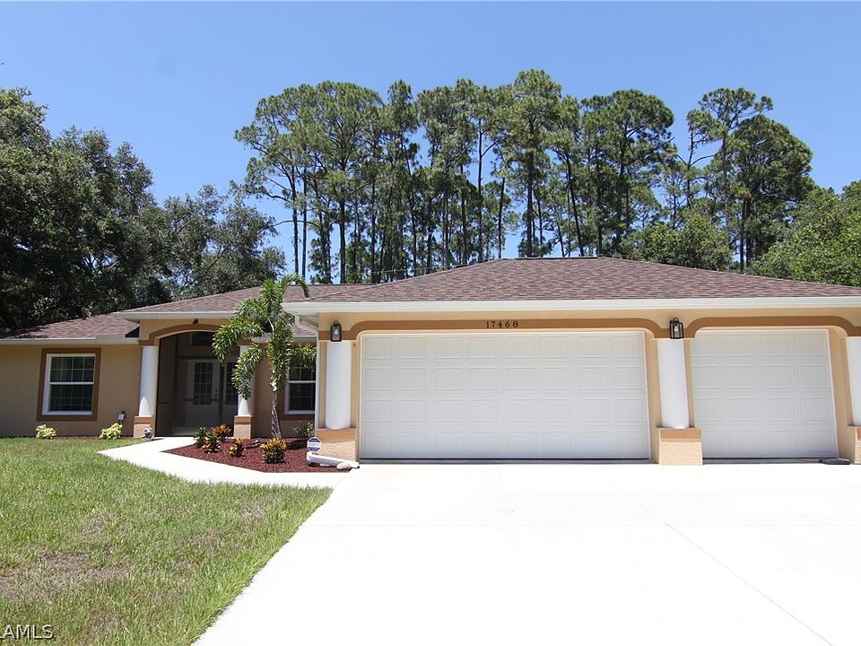 Rare opportunity to own a 3 car garage, 3 bedroom, 2 bath with an open floor plan and great room. Custom built in 2019.This home has an additional 7 year structural warranty and 7-year parts and labor on the air conditioning system. The beautiful kitchen features tier/level 4 granite counter tops, stainless steel appliances and slow closing doors on cabinets and drawers. There is matching granite in the bathrooms and on all the windowsills. The large 3 car garage can accommodate a 2500 truck and features an extra wide driveway. It has a separate dining room and a dinette area next to the kitchen. The master suite has a tray ceiling, walk-in closet, and a master bath with double sinks, Jacuzzi tub, and walk-in shower. The home has Impact windows and doors throughout except lanai windows with hurricane shutters so you can safely store your patio furniture in the event of a storm. This home has a screened in front porch and back lanai. Home features an outdoor brick paver patio and screened in Large lanai. There is an in-door laundry room and a laundry sink in the garage. This home is not in a flood zone. Here's a big bonus, Assumable VA Loan at 2.25%, $180,000 to assume.