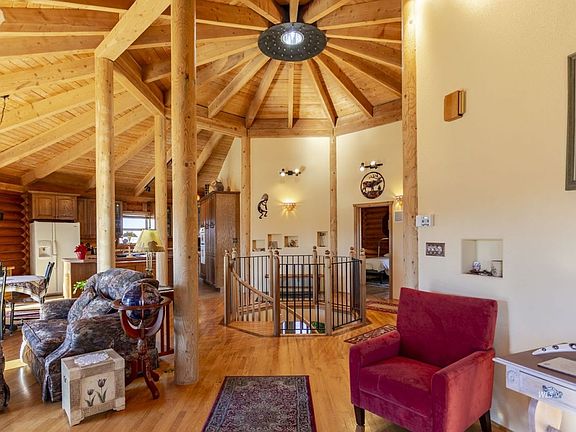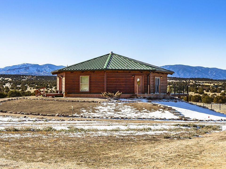 Mountain Octagon - When EIGHT, makes Great. Thoughtfully planned unique home. Features interlocking log construction known as Navajo Hogan. The unique shape allows for enjoyment of the panoramic mountain views and truly brings the outdoors inside. This architectural gems main floor features an open floor plan. The kitchen, dining and living room are all open with mountain views and vaulted ceilings. This floor-plan offers opportunities for either elegant or casual entertaining with intimate spaces for downtime: three bedrooms and three baths with lots of potential. Outside enjoy 40 acres with historic pond, wrap around deck to allow lots of room for outdoor enjoyment, 30x40 detached garage, RV hook-up and fenced in garden area with electricity and water. Wildlife is abundant here including deer, elk, antelope and a variety of birds -- short commute to town of Pueblo. If you're looking for your dream home with breathtaking views, this is affordable elegance that fits your lifestyle.