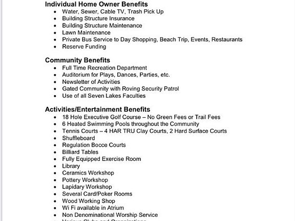 - Services included: Association Management, Cable TV, Golf, Insurance, Internet, Legal/Accounting, Maintenance Grounds, Pest Control, Recreation Facilities, Reserve Fund, Road Maintenance, Sewer, Street Lights, Security, Trash, Water