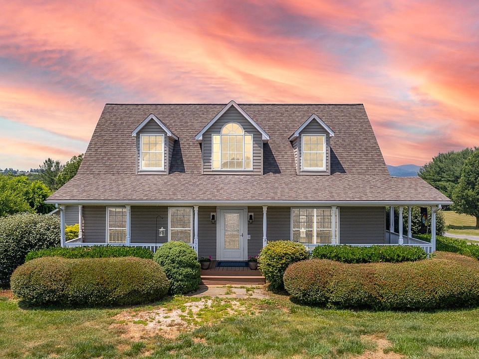 Stunning views of the Peaks of Otter & the Blue Ridge Mountains! Immaculate Cape Cod on a corner lot in a sought after Bedford location. Open floor plan and lots of storage in the spacious kitchen including an island w/ a pullout table for eating & a pantry w/ a sliding barn door. Main level primary bedroom & bath with a garden tub & a ceramic tile shower. The terrace level has a kitchenette & a full bath and offers multiple options. It could be an in-law suite, game or theatre room w/ a snack area, workout room, and more! The upper level offers 2 additional spacious bedrooms & a full bath. Sit back & relax on the wrap around porch and covered back deck which is perfect for entertaining. The property comes with a chicken coop that is equipped w/ solar panels, a bountiful garden, fruit trees and more! Check out the Hugelkultur Bed in the backyard! You will also love the detached 3 car garage with 10 ft doors. Country living only minutes from the Town of Bedford.