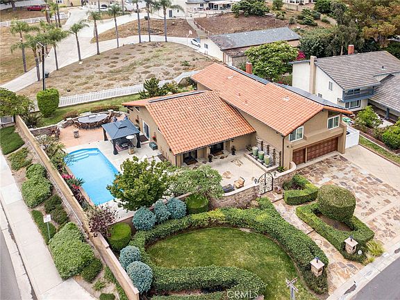 Absolutely Stunning Yorba Linda Pool Home with Amazing Curb Appeal! The beautiful wrought iron front gate takes you into the stone accented patio, custom fountains & lush landscaping. The Carrera Iron double doors open into this amazing home. The Living Room features distressed hardwood flooring & soaring ceilings. Throughout the home you'll find gorgeous etched glass dual pane windows, shutters, travertine flooring & recessed lighting. The beautifully remodeled kitchen has Brazilian granite countertops, lots of cabinet space, & high end stainless-steel appliances, including GE Monogram 6 burner cooktop, double oven, & new counter depth refrigerator. There is an LG microwave & Whirlpool dishwasher. The spacious family room also has the quality distressed hardwood flooring, built in cabinets & a gorgeous stone fireplace w/ natural wood log, & granite mantle. The extra large master bedroom has vaulted ceilings & triple pane windows. The recently remodeled luxurious master bathroom features a quartz double sink vanity, jetted tub and shower w/double shower heads, & TWO walk-in master closets. There are three additional bedrooms, including a Main Floor bedroom. The other two bathrooms have both been updated. The home has an inside laundry room as well an office/storage area with a pocket door. The gorgeous backyard features a Beautiful Pool with waterfalls spilling off the stacked stone planter. The pool was recently resurfaced. This Entertainer's Backyard has a built in fire pit as well as custom granite topped BBQ area that seats 8. The landscaped backyard has a grassy lawn & a gated side area with 3 storage sheds. There is a newer water heater & whole house fan. The attached 3-Car Garage has storage racks. The home has solar panels to keep the power bills low. No Mello Roos or HOA Dues. Award-Winning PYLUSD Schools. Yorba Linda is known for its walking & horse trails and this home has trails nearby. Shopping, Parks, & Dining are perks of this great community. Welcome Home!