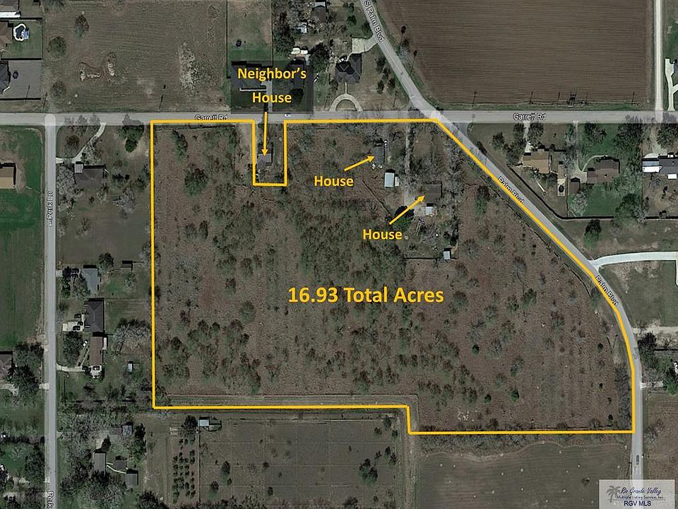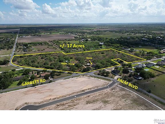 This is a very good piece of development land on the SW corner of Palm Blvd and Garrett Rd. The land is outside the city limits in Cameron County. The tax rate is a very low 1.89%. There is a large Harlingen water line in front of the land and Harlingen sewer across Garrett Rd. on the NE corner of the intersection. The land borders a drainage canal on the south side and the flood zone for the whole property is Flood Zone X (the best). The irrigated land also has access to electricity. There are two old houses that come with the land that could be repaired and sold separately but they do not add value to the property and are being sold in "As-Is" condition. There is also a small piece of land that is cut out of the acreage along Garrett Rd. that is owner by a different land owner. That house does not convey with the sale of this property (see the photos to study the survey). There are no deed restrictions on this piece of property. There is no zoning because it lies in the county.