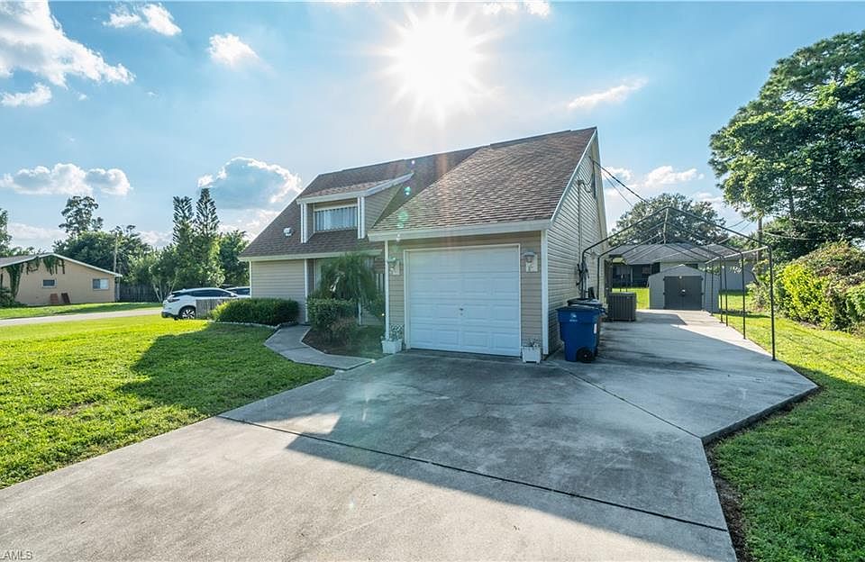 Charming 2 story home on corner lot in San Carlos Park! MASTER SUITE is upstairs and includes full bathroom, walk in closet, attic access for storage, and bonus DEN/office. 2 bedrooms and 1 updated/accessible bathroom are downstairs. Vaulted living area has sliders leading to lanai. Updates include NEW AC, 2016 ROOF, large screened LANAI replaced in 2018, 2014 privacy FENCE, hurricane SHUTTERS, and septic recently cleaned out. Tons of storage plus huge walk in attic over garage. SHED on concrete pad with hurricane tie downs. 1 car garage with extra wide driveway leading to additional side driveway with framework for canopy cover. Great location situated just minutes from Gulf Coast Town Center, Restaurants, Shopping, and Airport. Come take a look at this well maintained home!