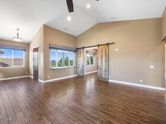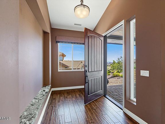 Back on the market! This stunning Parkside in Prescott Lakes home is conveniently located right on the edge of the Prescott Lakes Golf Course, at the 16th tee box! Step inside through the oversized front door of this custom-built home and be welcomed by high ceilings that create a bright and open space. Throughout the house, you'll find beautiful, scraped hardwood-look tile flooring throughout . The great room features a wet bar equipped with a Beer Meister, mini fridge, sink, a large picture window with views of the picturesque Granite Mountain, surround sound, and