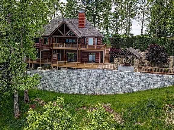 Be astounded by stunning views of Lake Chatuge and the surrounding Blue Ridge mountains. The inviting living room has a stone stacked wood burning fireplace which open to the enormous entertainment deck. The open floor plan envelopes the state-of-the-art gourmet kitchen with Sub Zero fridge, Wolf gas stove and oven, wine cooler and granite counter tops. Master on the main. The lower level includes a theater room, wet bar area, home gym and two addl guest rooms. The lower outdoor patio area hosts a waterfall with a pond, custom outside bar and wood burning fireplace.