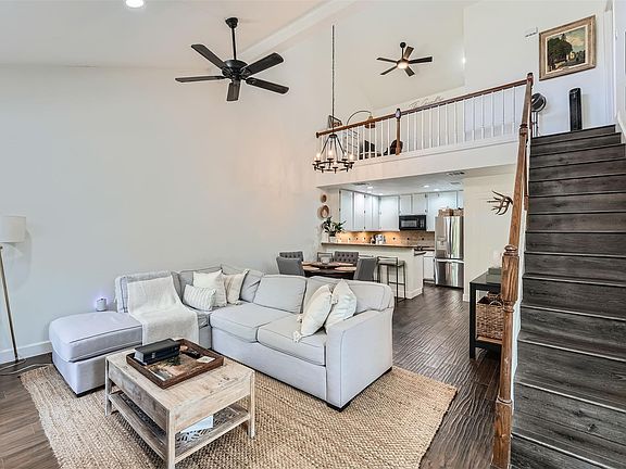 Thoughtfully designed home nestled in a gated community offering a serene lifestyle with lush green spaces and a community pool. Ideally located just minutes from The Domain, downtown Austin, and major tech corridors, with convenient access to 183 and I-35, this home is a perfect blend of comfort and connectivity. This two-story residence features an ideal floor plan with two spacious bedrooms, each with its own ensuite bathroom one on the main level for convenience, and the other upstairs for added privacy. The living room is the heart of the home, with soaring ceilings, a charming brick wood-burning fireplace, and a dramatic open-railed loft above that brings in abundant natural light and a sense of openness. Wood like flooring flows throughout, creating a warm and inviting atmosphere. The kitchen is open to the dining and living spaces, making it ideal for entertaining or everyday living. Step outside to your private patio, perfect for morning coffee or winding down at the end of the day. Whether you're seeking easy access to city life or a tranquil retreat to call home, this move-in ready residence offers the best of both worlds in a sought-after North Central Austin location.