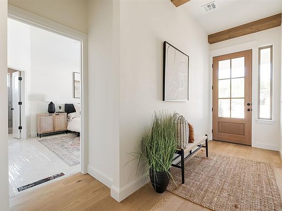 Easy living meets timeless style in this move-in ready Modern Farmhouse located in the final phase of The Plaza at Town Square! The popular Beckett floor plan offers an open-concept layout perfect for everyday living and entertaining. Guests are welcomed through a charming entryway that leads into a spacious kitchen and living area, complete with a corner brick fireplace that adds warmth and character. The primary suite features a spa-style glass shower, freestanding tub, dual vanities, and a generous walk-in closet. Two secondary bedrooms and a full hall bath with a designer accent floor complete the thoughtful layout. Enjoy all the perks of The Plaza at Town Square, including being a short walk from the resort-style pool, clubhouse, fitness center, youth rec center, playground, scenic greenbelt, and pond with a fishing dock. Visit our model home at 3717 Union Park Place, open daily, to tour the community and learn more!