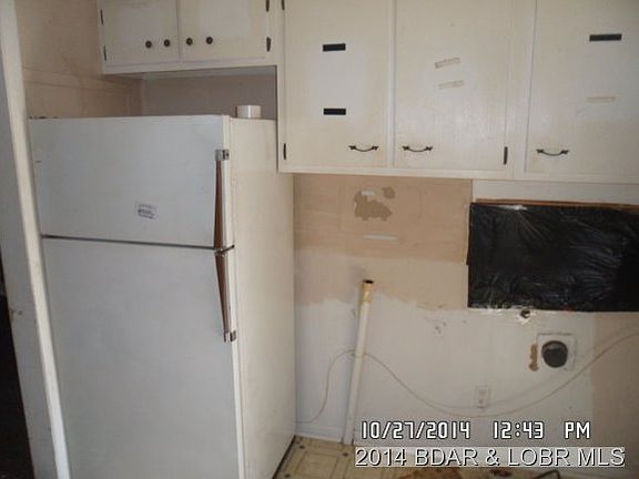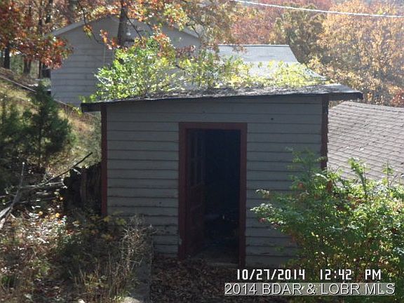 Small cabin built in the 1950's. Winter view of the lake. Small 1 car detached garage. Also, shed for extra lawn care and storage.