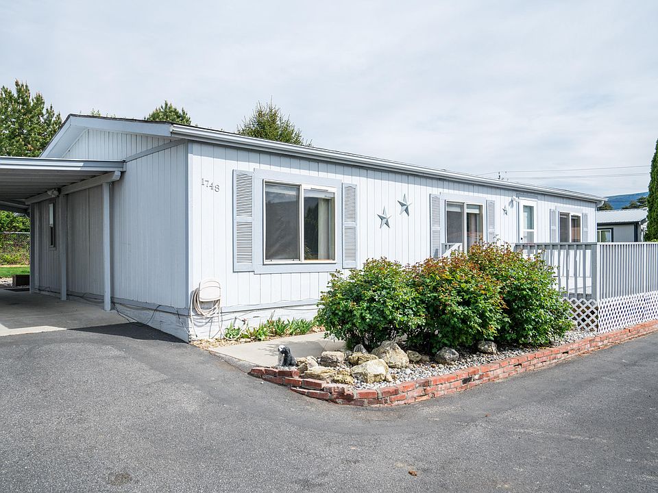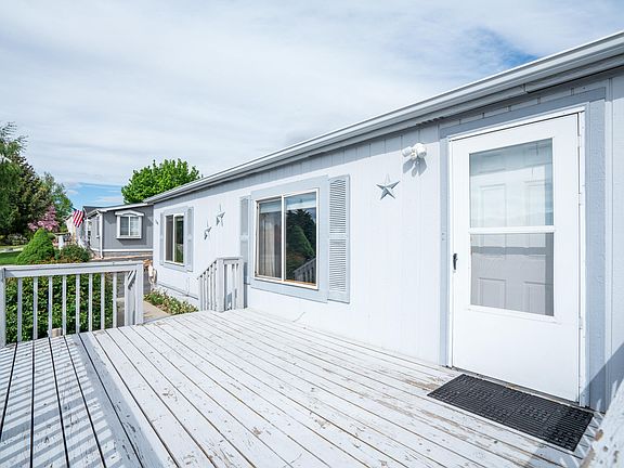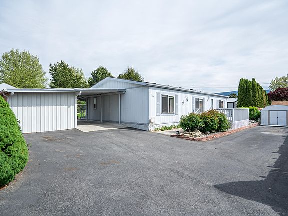 Well maintained 3 bedroom manufactured home on a leased lot. The kitchen is open to the dining area with an eating bar. The master suite is roomy and at the opposite end of the other bedrooms. Enjoy the oudoors on the covered deck in the private backyard., 2 detached sheds, one shed/shop attached to the carport, lots of parking, room for entertaining....