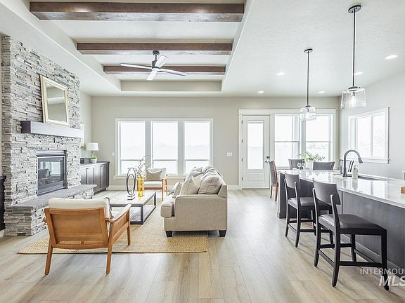 The Owyhee by Sunrise Homes. This stunning residence offers all the quality finishes desired in new construction. There is also a spacious 2-car garage (27' deep) and a generous 41' RV bay. The gourmet kitchen, featuring a 10' designer island, is perfect for entertaining. The open-concept great room, complete with an oversized dining area, provides ample space for relaxation and gatherings. Enjoy the comfort of generously sized bedrooms, including a luxurious master suite and a convenient "pocket office/tech room." This thoughtfully designed floor plan has everything you need. You'll love using nearly 1000 sq ft of garage space. Outside you will get full landscaping front and back with automated sprinkler systems and full fencing included. Sunrise Home is a local builder with a sterling reputation and high end finishes. This home is located in the new Dagger Falls Subdivision.