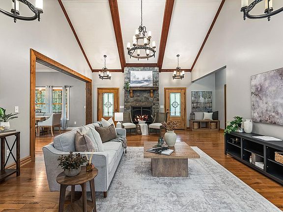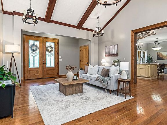 Stunning 2018 custom brick ranch on 6 beautiful, wooded acres just minutes from town! This 3-bedroom, 2-bath home features 2590sft of living space plus a full, partially finished basement offering endless possibilities for expansion. Open-concept floor plan with soaring ceilings, rich hardwood floors, and abundant natural light. The chef's kitchen boasts custom cabinetry, leather granite countertops, stainless steel appliances, and a large island perfect for entertaining. Spacious primary suite with walk-in closet and spa-like bath featuring double vanities, soaking tub, and tiled shower. Generous sized secondary bedrooms and stylish finishes throughout. Relax on the covered porch while enjoying your morning coffee taking in the peaceful country setting or enjoy the flexibility of the basement for a home gym, office or recreation space. Combining privacy and convenience, this property offers tranquil country lifestyle while being only minutes from shopping, dining and schools.