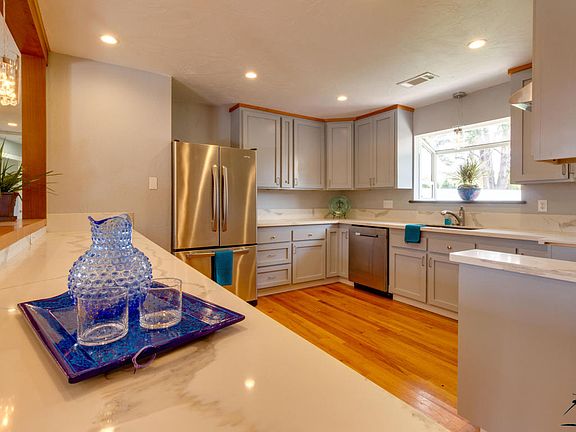 Just Wow! You have to see this home to believe it. From the amazing redwood hand planed redwood bar, trim and accents throughout , to the incredible lighting and wood floors, to the quartz counters and slate in the bathrooms and new wood stove ...This home has not only been prettied up, but has been styled up just for you. The view from your kitchen to the back deck will make you smile. Perfect for those weekend BBQ's. You like privacy right in town? You've got a half acre here, fully fenced and gated. Sit on your deck and watch the kids play or your garden grow. Great home for entertaining. Take a look at the photos or make an appointment to see this special home today.