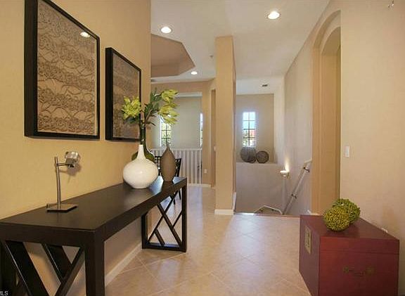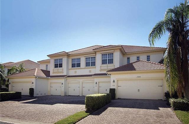 Neat, clean,,,relaxing! A stunning second floor coach home with 3 bedrooms, 2 baths and an attached 2 car garage that was only used 3 months per year. Backing up to a preserve, this TURNKEY FURNISHED end unit offers peacefulness and privacy. The staircase leads to a formal dining area, a large great room, kitchen and 12 x10 breakfast room. The kitchen features 42 inch upper cabinets with molding, solid surface counter tops, stainless steel appliances, a Butler's pantry and a laundry room. Plantation Shutters. 24 inch tile flooring set on the diagonal flows throughout the living area. Bedrooms are carpeted. Sliding glass doors in the great room and master bedroom open to the expansive lanai. The large master suite has his/hers closets and the bathroom has dual vanities, a huge tiled shower and a soaking tub. There is a generator, back-up battery and manual cranks for the electric storm shutters. The community center has a tot lot, community pool, exercise facility and social room. Emerson Square is conveniently located close to shopping, restaurants, cultural activities, Gulf Coast Hospital, beaches and the Southwest International Airport. You must see this home for yourself!