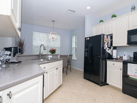 Enjoy this immaculate 3 bed, 2 bath, attached 2-car garage, end unit condo with tile throughout and new carpet in the bedrooms. Nice size kitchen with pantry, breakfast bar and breakfast area, plus an abundance of cabinets finished in crown molding. Split bedrooms, with master suite offering sliders leading out to the enclosed patio and lovely master bath with his/her vanities, corner soaking tub and enclosed shower with tile and glass surrounding. Arches and niches throughout add to the appeal of this home with great-room and additional sliders leading out to the enclosed screened-in lanai. Ideal location, close to the airport, variety of beautiful outdoor malls, dining, Germain Arena, FGCU and beach lovers, only about a 20 minute ride and great golf courses surrounding the area. Emerson Square offers amenities including club house, pool and fitness for family fun!