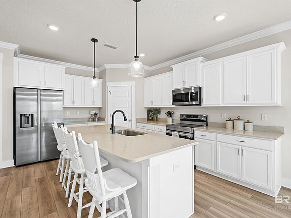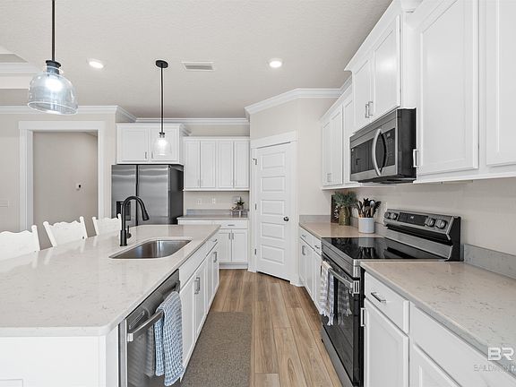 Gold fortified, like new home in Quail Landing! This Foley neighborhood allows you to get to town and the beach within minutes. You also have the convenience of being close to grocery stores, restaurants, and entertainment. From the moment you step inside this home, you instantly feel its cozy and welcoming charm, enhanced by the beautiful luxury vinyl flooring, light and airy paint colors, custom light fixtures, and crown molding. The tray ceilings and chic quartz countertops throughout also add to its appeal. This is a great floor plan. The kitchen, living room, and breakfast area are open and flow well, perfect for gatherings and family time. The kitchen is equipped with stainless appliances, a large island with additional seating, and pantry. The master suite is spacious and features tray ceilings, and the master bath has a garden tub, separate shower, and a walk-in closet. Another desirable aspect of this floor plan is the front guest bedroom with its own ensuite. The private backyard offers a covered patio and is completely fenced. There is a 4’ gate on one side and a 10’ gate on the other. The owners have also extended the driveway allowing for more parking and easy access to the backyard. There is a double garage, and all the appliances convey to include the washer and dryer. If you’re looking for convenience, upgrades, and a home that is in pristine condition, this is it!