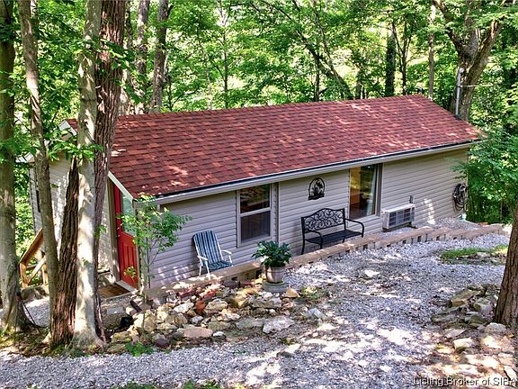 Check out this New Listing located 5 miles from Corydon! Move-in Ready Cabin/Cottage Home sits on 1.4 wooded acres with Carport and Fire Pit on the bluff overlooking Blue River. Great place for getaway weekends, fishing, boating or entertaining. Home has recently been renovated with the following: New Roof with new front gutter and gutter guard. New windows, Bathroom and Kitchen remodeled, wood flooring, walls restored with tongue and groove wood and insulated. LED lights and 2 ceiling fans. New Foundation support posts, retaining wall in front of cabin replaced. Driveway retaining wall replaced with stone and new gravel on driveway and walkway. Custom built 10x12 shed w/electric and concrete floor. deck boards replaced where needed. Main water line and internal water line replaced with PEX. Ring security camera installed on side of shed (Just needs internet activation). Cabin is on a bluff/hill and is NOT in a flood plane. Inspections are welcome but seller is selling property AS-IS.