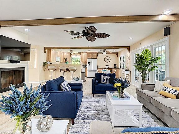 Welcome to 1749 Knights Way situated in a serene, park-like cul-de-sac in the heart of Naples, FL. This beautifully designed 3-bedroom, 2-bathroom house is perfect for those seeking a vacation retreat, investment property, or a new home for first-time buyers. The spacious 2,061 sq ft of living space includes a great room featuring a cozy fireplace, beamed ceiling, and French doors leading to a picturesque lanai. Entertain guests with both formal and casual dining options, while enjoying the convenience of granite baths, a wet bar, and a recently upgraded laundry area. The kitchen boasts new appliances, cabinets, travertine counters, and a stylish backsplash. Marvel at the stunning marble and tile flooring, elegant crown molding, and charming plantation shutters throughout. The luxurious master bath adds a touch of sophistication to this exceptional property. Outside, the paver driveway, walkways, courtyard, and lanai are surrounded by beautiful landscaping, with a lighted precast marble lion's head enhancing the home's curb appeal. Located just minutes from Fifth Ave, pristine beaches, the pier, shopping, and more.