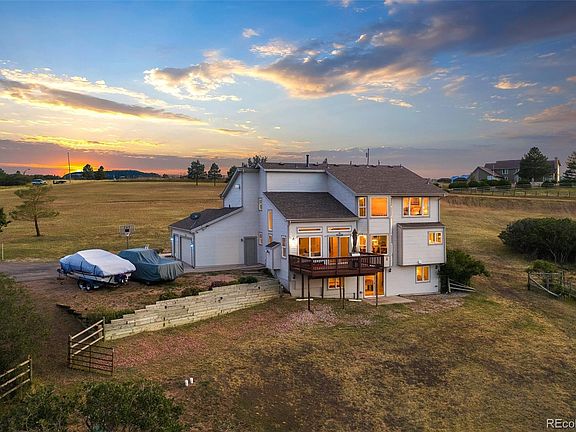 Serenity in Colorado! Take a look at this amazing, peaceful sanctuary on 10.44 acres. This home has been lovingly cared for and updated through the years and is ready for the next generation to enjoy all that it has to offer. Walk through the front door and you will be greeted by loads of natural light that fill the large open spaces in the home. You will see a nicely appointed office, formal sitting room, formal dining room and a large open kitchen that connects to the main level living room. A deck awaits just off the living room, where you will enjoy the endless sunsets that light up the front range sky. A guest bathroom and laundry room are found on this level, located near the spacious three-car garage. The lower level offers a large living/entertaining/fitness room, a bedroom and full bathroom, an amazing theater space, and a music/play/flex room. The upper level offers a large primary bedroom suite with a full 5 piece bath and walk in closet, a craft room/office, and two additional large guest bedrooms along with a full bathroom. This home has been updated from top to bottom and you will notice the attention to detail as you walk through. Wait until you see what awaits outside - a beautiful park-like yard that is partially irrigated by the well that allows for horses or other domestic animals. You could easily build your dream stable and ride directly from your property to the Bridal trail, which passes next to the property border. Like to grow your own veggies? In addition to animals, the well permit allows irrigation of up to 13,000 sf., providing ample space to grow on the lot. Do you need even more storage space? A large shed at the bottom of the property provides myriad storage possibilities. Whether you are looking for a horse property or just some peace and quiet away from the city, the possibilities are endless!