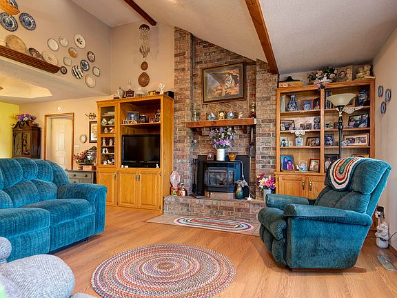 This cozy and lovingly cared-for 3-bedroom, 2-bathroom home is tucked away on a peaceful 1+ acre lot, surrounded by beautiful, mature trees, offering the perfect mix of privacy and comfort. Inside, you'll be greeted by a warm and inviting living room with vaulted ceilings, a charming pellet stove, and fresh newer LVP flooring that runs throughout most of the home. The kitchen is a cook's dream with plenty of solid surface counter space and ample cabinets, while the dining area provides the perfect spot for enjoying family meals. Outside, the spacious covered back deck with composite decking is ideal for hosting gatherings or simply soaking in the peaceful views. The cozy front porch offers a quiet space to unwind with a cup of tea. There's also a 10' x 35' shop area and 12' x 35' RV carport/storage, giving you plenty of room for all your hobbies and outdoor adventures. With low-maintenance steel siding, a roomy 2-car garage, and a serene atmosphere, this home truly feels like a retreat from the world.