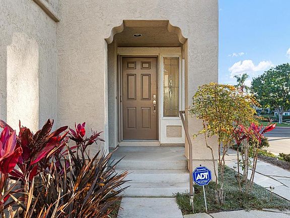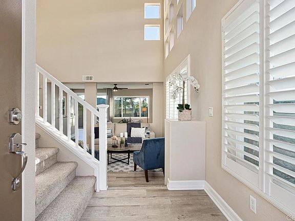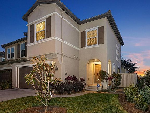 Move right into this beautifully updated, spacious home nestled west of the El Camino in the gated community of Poinsettia Heights, minutes from the beach. This 2,169SF, 4 bed/2.5 bath residence, situated on an elevated cul-de-sac lot, with one attached neighbor & no neighbors behind, offers tranquility & privacy akin to a detached home. Enter the inviting foyer to the living room where soaring ceilings, large windows, & architectural accent windows bathe the space with natural light. Follow the ground floor’s wood-like laminate flooring to discover the seamlessly blended family room & kitchen. Both bask in a lush garden view through large windows & sliders leading to a private outdoor patio. The gorgeously updated kitchen shines w/stainless-steel appliances, striking granite countertops w/full backsplash, expanded center island w/seating, & Shaker-style cabinets w/soft-close drawers/cabinet doors, pull-out organizers, & corner turntables. The focal point of the cozy family room is a fireplace w/marble surround & built-in media cabinet w/hookups. A formal dining room, laundry room, & an updated 1/2 bath round out the first floor. Heading upstairs, enjoy a luxurious primary bedroom w/high ceilings & elegant plantation shutters. The updated ensuite bathroom features a spacious, frameless glass walk-in shower, a stylish textured tile wall, & double vanity w/newer quartz countertop & fixtures. Adjacent to the bathroom, a large walk-in closet offers ample storage. Down the hall are a loft space, 3 more generously sized bedrooms, & an updated bath w/double vanity. Most operable windows new in 2021 & energy-efficient/quiet HVAC units new in 2022. Washer/dryer, & refrigerator included. 2-car garage, 2-car driveway. Low HOA fees. Award-winning Carlsbad schools. Close to Carlsbad Village, shopping, restaurants, beaches, world-class golf courses, parks, lagoon recreation, & Legoland. Live the coastal dream in this gorgeous Carlsbad home!