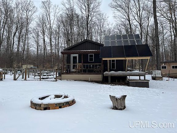 OFF GRID LIVING but on a year round county maintained road, perfect for your lifestyle! Nestled on 19 ACRES with towering Maples, some mature and great for harvesting maple syrup. This compact home has all the amenities for you to start your homestead in the U.P.! One bedroom and another room that could be used as a bedroom or den area, open kitchen/living room, full bathroom including washer hook up. Heated with propane space heat and wood stove (both just replaced and seller will leave the wood currently on site. You can rest assured that the Solar power & generator power will be sufficient for year round living as the current owner added 4 new panels to the previously existing panels. The off -grid power is 1.2 Kilowatt solar wired at 24 volts, 100 amp charger controller with 6,000 watt inverter/charger, and 14 AGM batteries wired at 24 volts. There is a Generac 15,000 watt propane generator that automatically turns on when needed during rain or snowy days. The covered back deck is a perfect spot to rest after a day’s work in the garden. Speaking of gardens…you’ll have no shortage of space to cultivate your crops with a 30x40, 12x40 and 16x24 gardens! There are 9 raised beds that grow sunchokes, blueberries, grapes, and leaves room for tomatoes and other veggies. The fruit trees are plentiful with cherry, peach, pear, apple and plum. The 16x24 green house is wired for generator & lights and there is even a canning room! The 16x32 barn can house chickens and goats, with a coop & stalls. Small storage shed plus a 40’ metal container included. Situated in Germfask on Edge Road, you are just 1 mile from M77. Deeded access to Lake Ann Louise and centrally located in the U.P. for snowmobiling, ATV riding, hiking, biking, and enjoying the many lakes & rivers. Come create your sustainable living experience on this unique property!