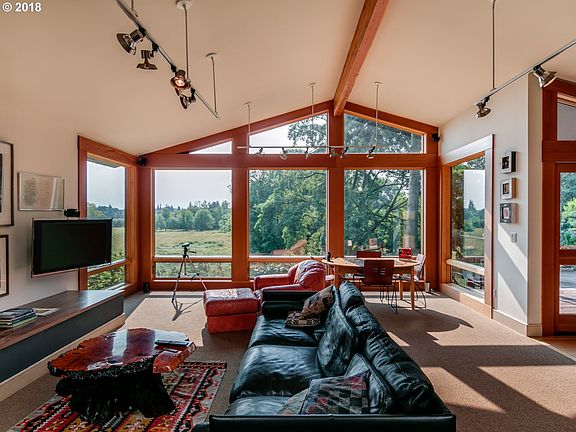 Come enjoy the views from the expansive deck of this stunning NW contemporary home overlooking the river basin with Mt Hood in the background. High end finishes throughout this home include gourmet kitchen, lighted built-ins, hardwoods, Anderson windows, high ceilings, & much more. With a dream shop including a studio/bath/kitchen on over 14 manicured acres w/ pasture, water rights & a barn.