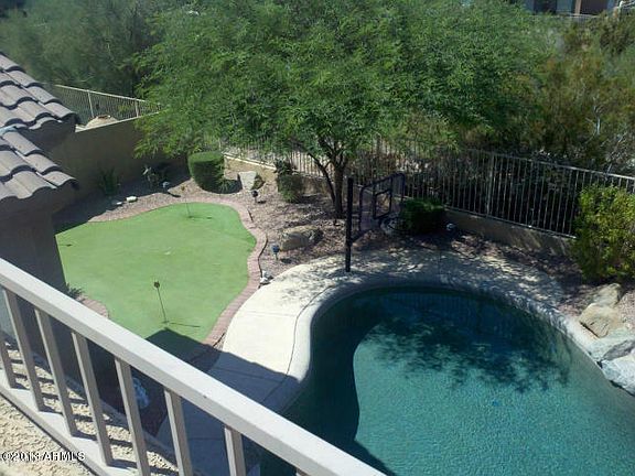 This 3 car garage, 4 + bdrm, 3 full bath home with POOL, Putting Green, view fence is a MUST SEE! Stay cool under the extended patio. Or enjoy breath taking views from second story deck. Outside entrance to full bath and bedroom from pool area, upstairs loft, large eat in kitchen, enormous family room, custom cabinets in garage, tons of storage. This is a very private Lot in qiete setting. Home is Priced to sell. Resort Style Community, trails, lakes, work out facility, community pools &community center, major shopping and retail. Excellent Place to Live!