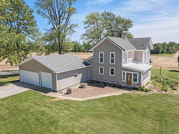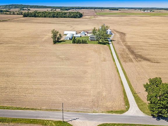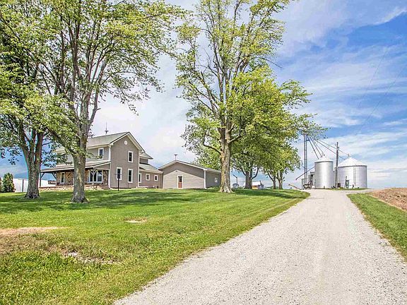 Take a seat on the front porch swing and take in the amazing views of this 6.6 acre property. This beautiful farm has endless possibilities. Homeowner updated the house with new siding, roof, windows and exterior stone work done all in the past 10 years. Hardwood floors on the main and 2nd story are hiding under the carpet waiting to be refinished. Home has an open concept kitchen and dining area with a massive living room that is ready to welcome family and friends. Currently has 3 bedrooms, but there is an additional room on the upper level that does not have a closet. Property includes 2 shops, 2 hoop buildings and 6 grain bins. Survey is complete so please contact agent for information. 3 acres of tillable land in front of the home.