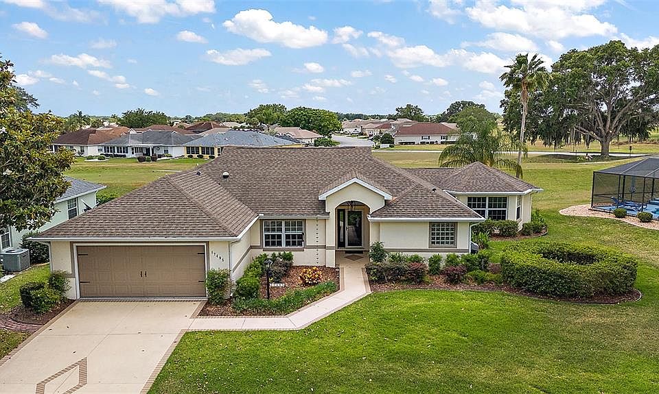 Exceptional GOLF FRONT 3/2 Custom Block and Stucco Monterey with a 2 Car Garage just 500 Steps to the Country Club! Golf Course in Back of Home and Across the Street! Beautiful Privacy! Open Concept Floor Plan and Split Floor Plan with the Primary Suite commanding one side of the home offering both the owners and guests privacy. The Spacious Primary Suite boasts access to the back patio with a birdcage, 2 Walk in Closets and an En Suite bathroom with Dual Sinks, Large Soaking Tub, and a Walk in Shower. The Primary Suite has private access to a Custom Living Room for added convenience and additional living space! Stunning Custom Gourmet Kitchen is a Chef's Dream, featuring Granite countertops, Maple cabinets, Stainless appliances, Designer Light fixtures, Farmhouse sink, Vaulted ceiling and Generous breakfast bar. The spacious eat in kitchen opens to the Family room with a tremendous Golf Course View! This home is perfectly designed for entertaining family and friends! Large light and bright living room with open concept to the kitchen, dining area and patio. The back patio has a birdcage with sun shades and is perfect for enjoying the beautiful Florida weather and the breathtaking Golf Course View of the 1st TEE BOX! This stunning custom homes is equipped with Wide Luxury Vinyl Plank Flooring (10-2023), a Water Softener (2022), HVAC (2018), ROOF 2014, Solar Hot Water Heater (2010 ) and addition of Florida Room (2001 permit) creating a spacious and vista view of both golf course in back of home and across the street from the home. In addition to the many Upgrades and Custom Features there are Upgraded Gutter Guards, a Termite Bond and a Home Warranty. (transferable at closing). Home is Furnished. Stonecrest is a 55+ gated golf course community with all the amenities, pools, pickleball courts, softball, 18 hole championship golf course, Broad Stripes Golf and Social Club and over 80 different clubs to join! Stonecrest is just a bridge away by golf cart to the Villages. It is a community with Private Roads and 24 Hour Security! As a private gated golf course community, you can expect a high level of privacy and security. Overall, this home offers a combination of luxurious features, a desirable location, and a secure community setting. A WONDERFUL LIFESTYLE AWAITS YOU IN STONECREST!