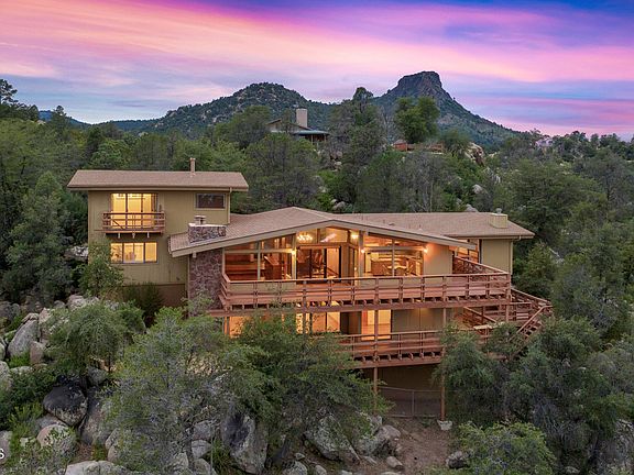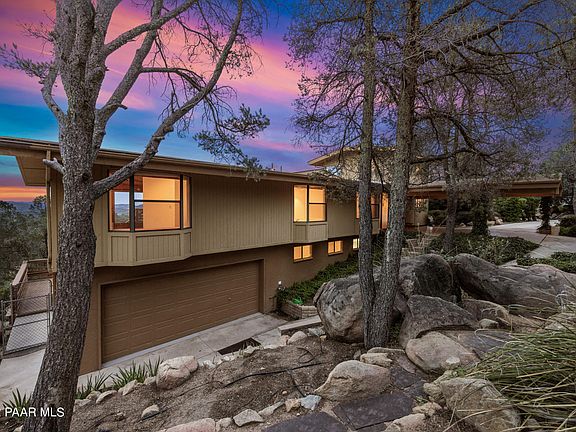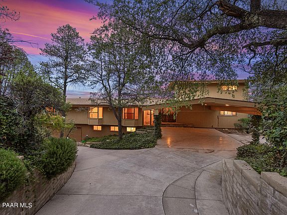 Located on a prime elevated lot (plus additional lot included) and walking distance to Prescott's historic downtown, this beautiful stately home boasts sweeping panoramic views including Mingus Mountain, the Bradshaw's, San Francisco Peaks, and Granite Mountain! The home has outstanding curb appeal with mature oak and pine trees mixed with boulders and water features producing a serene park like setting. The home offers lots of parking and garage space with a convenient circular driveway with porte cochere, and a two car attached garage as well as a two car detached garage. The interior of the home features a split level floor plan, engineered hardwood flooring throughout the main level, wood trim and doors, vaulted ceilings, surround sound, CONTINUE