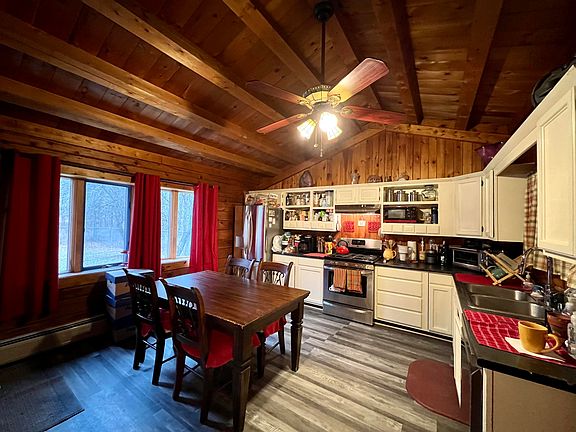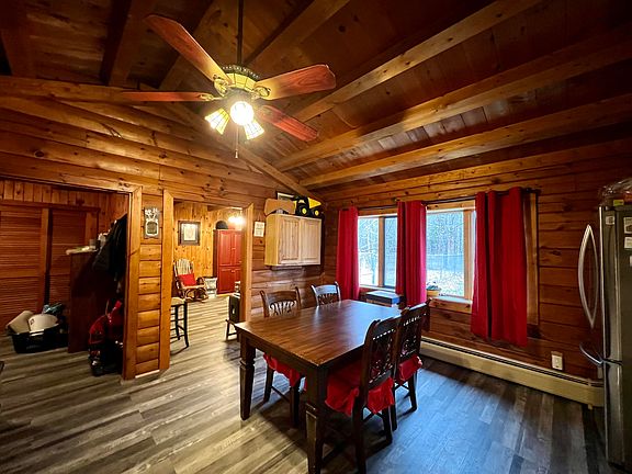 Maine country log home for sale in Prentiss Township, Maine. The first floor features a kitchen, dining room, living room w/ a wood burning fireplace, an office, a half bath with laundry, and a three season enclosed porch. The second floor features three bedrooms and a full bathroom. There is a full unfinished basement. This home has private well & septic and sits on 36+/- country acres. The large yard has plenty of space for gardening and has a large fenced in area. There are 3 storage sheds, a shooting shed w/ a wood stove, and a 230-yard shooting range. Great area for hunting and fishing. Close to East Grand Lake and the grand lakes region.