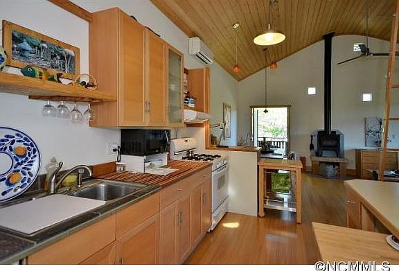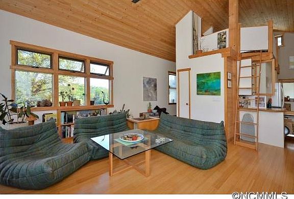 -Located between Downtown, hospitals and the River Arts District. This 3/2 NC Healthy Built adorable home has 14ft barrel vaulted ceiling with an open kitchen, dining and living room. Carport was designed for a roof garden. 8x24 deck off living room, small loft over kitchen, solar hot water and radiant floor, metal roof, Japanese soaking tub in full bath, stained concrete floors, mosaic tiled shower. All utilities are less than $80/month.