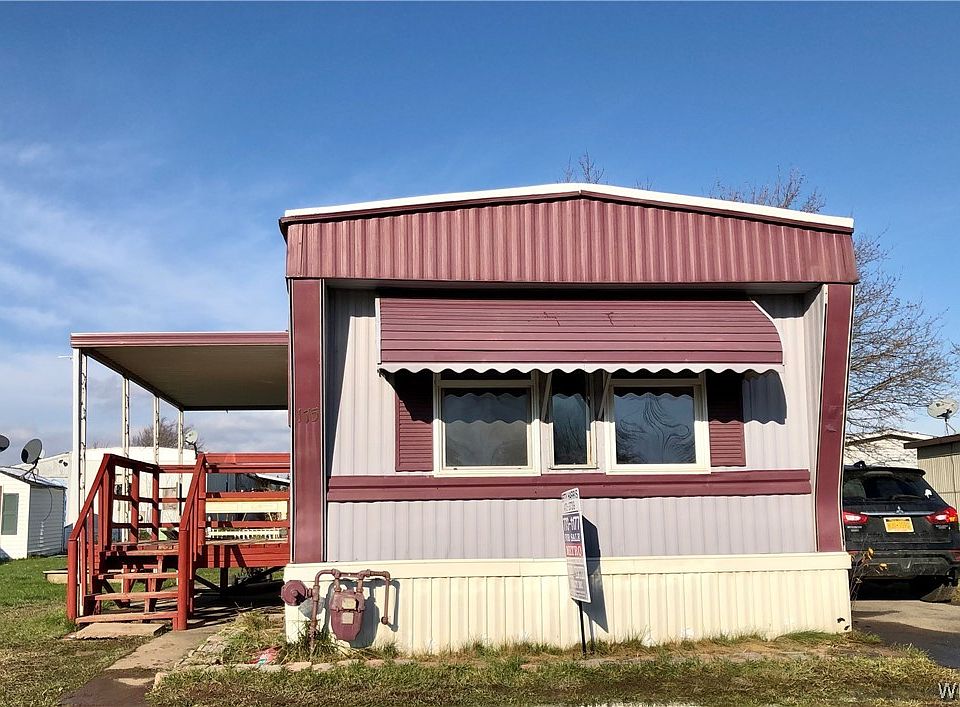 PROPERTY LOCATED OFF 6035 S TRANSIT (SOUTH OF ROBINSON/DYSINGER) VILLAGE MOBILE HOME PARK - 175 BROOKSIDE AVENUE - HANDI CAP ADAPTABLE -INTERIOR FRESHLY PAINTED AND MOVE-IN READY. FRONT DECK ENTRY - ALL BRAND NEW WALL TO WALL CARPETING LIVING ROOM, HALL, 3 BEDROOMS. KITCHEN HAS "HARDWOOD LOOK" LAMINATED FLOORS, GAS STOVE - BI DISHWASHER - WOOD CABINETS, NEW STAINLESS STEEL SINK, ROOM FOR ANY SIZE REFRIGERATOR + EXTRA COUNTER SPACE, PANTRY OR GUEST CLOSET. MOST BRAND NEW VINYL REPLACEMENT WINDOWS. MASTER BEDROOM, LARGE RECESSED AREA SUITABLE FOR DRESSER OR CHEST - DOUBLE CLOSETS. 9' BATH, TUB AND SHOWER, VANITY SINK, QUARTZ TOP - 2ND BEDROOM FEATURES DOUBLE CLOSET - 3RD BEDROOM (LAUNDRY/OFFICE) **IDEAL SPECIAL USE OR HANDICAP NEED WITH CONVENIENT LAUNDRY HOOK UPS/220 - HUGE WALK-IN LIGHTED CLOSETM, FULL ACCESS TO REAR EXIT DOOR WITH ROOM TO BUILD A RAMP AT DRIVEWAY OR ADD A CARPORT. PARK RENT $425 MO. PLUS UTILITIES, EST APPROX $100 A MONTH - RENT INCLUDES WATER, TAXES AND STREET PLOWING. BUYER RESPONSIBLE FOR LAWN AND DRIVEWAY MAINTENANCE. RECREATION CLUB HOUSE/POOL. CASH DEAL OR OWNER FINANCING. PARK APPROVED BUYER(S) AND ACCEPTABLE CREDIT REPORT. FAST CLOSING.