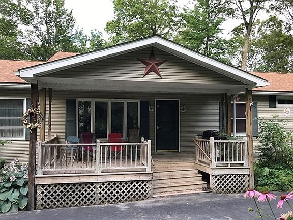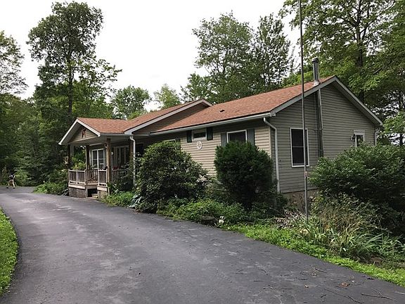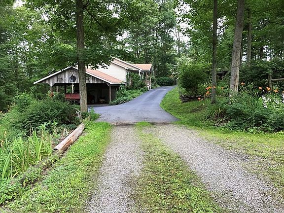 It's like living in your own private park! Perennial gardens and trees surround this roomy ranch home on nearly 4 acres. Kitchen with SS appliances and a pantry closet is open to the dining area and family room - perfect for entertaining. 3 bedrooms, 2.5 baths, large basement room with woodstove open to many possibilities. Large secluded sun porch overlooks the woods and pond. Attached 2-car garage with workshop area leads to the carport and paved driveway, large woodshed and two outbuildings. Damaged floor coverings have been removed, so you can install whatever you prefer.