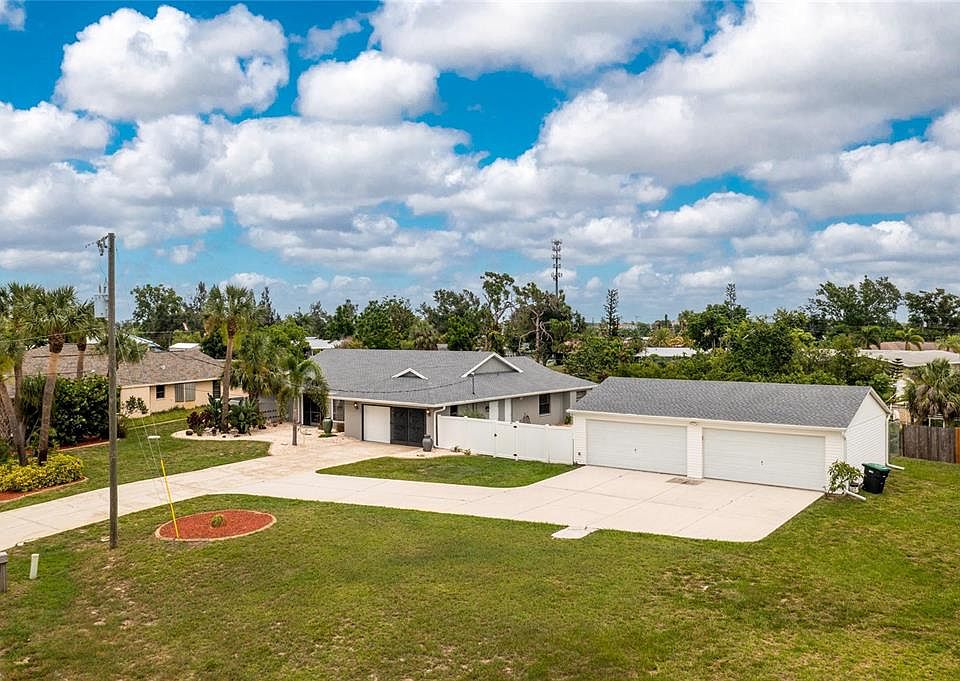 Situated on a triple lot with gulf-access canals, this three bedroom, two bathroom home is ready to welcome you home! Enter through double doors into a spacious entry that leads into the home's formal living room, with a separate dining room to the side, which leads into the kitchen and additional family room. The kitchen features a breakfast bar and generous cabinet storage and drawers, as well as stainless steel appliances, and a sliding glass door leads out to the lanai while the guest bedrooms are located just off the adjoining family room. A true split floorplan, residents can enjoy the privacy of the master suite, with double walk-in closets and pool access, on the opposite side of the home from the guest bedrooms. Accessible from multiple rooms of the house, the back lanai features a sparkling pool with canal view. In addition to the attached two-car garage, an additional four-car garage has been added to give owners the space to bring extra cars, boats, bikes and more! Located near Tamiami Trail, it's a short drive down to the shopping and dining that Punta Gorda has to offer, and is convenient to the PGD airport. Only one bridge to the Peace River, boaters can enjoy the true Florida experience of stepping from your backyard into your boat for a day on the water! Don't wait, call today for your private showing, this property is ready to be your home sweet home!