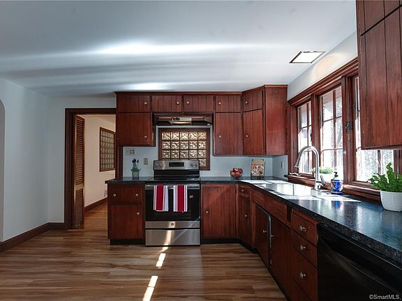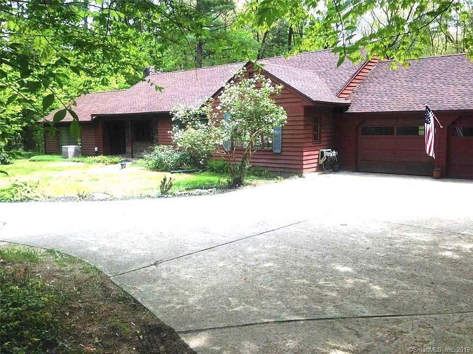 Rarely available on the Hill near Woodstock Academy, this spacious ranch with over 2500 square feet welcomes you with a slate entry, gleaming hardwood floors, 3 fireplaces and a flowing open floor plan. Perfect one floor living with 5BD/2FB all refreshed with new neutral paint throughout. Architectural details lend towards a Frank Lloyd Wright feel with field stone fireplaces, glass block wall inserts, and exposed beams in the family room cathedral ceiling. An open galley balcony overlooks another warm family room with hand hewn bar on the lower level, an impressive stone fireplace as a focal point, providing an additional 440 sq ft. 5 bdrms can easily be multi purposed space as a home office, hobby or exercise room. All bdrms have hardwood or composite floors, allergy free and provide ease in care. Kitchen boasts numerous recent updates with all new high end stainless/black appliances, a new counter, and new floor. Other updates include new 200 amp electrical service, new well pump, new water tank, new roof in 2017, R38 new insulation in attic, and bthrm remodels. Attached 3 car garage, with one bay being used as a workshop with woodstove makes a perfect getaway for woodworking or gardening. Home has central air and spacious yard on 3.1 acres with mature plantings. Estate sale, priced to sell. This one will not last as it has a unique charm of yesteryear, tastefully and carefully updated for today's discriminating buyer. We invite you to visit today.