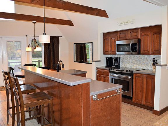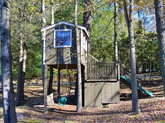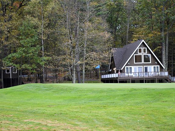 What a wonderful opportunity to have one of the most picturesque settings. This stunning Chalet overlooks the first green of Paupack Hills golf course. The home went through a complete renovation in 2010 with renowned builder Clemleddy Construction and looks like a showcase home. Both the main living room and family room boast large stone fireplaces and the home is flooded with light through all the windows which make you feel like you are outdoors. There is a large deck and patio for outdoor entertaining along with a tree house for adventure. The community has many nice amenities including access on Lake Wallenpaupack, swimming beach, fitness center, walking trails and more. Be prepared to fall in love!