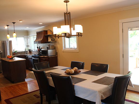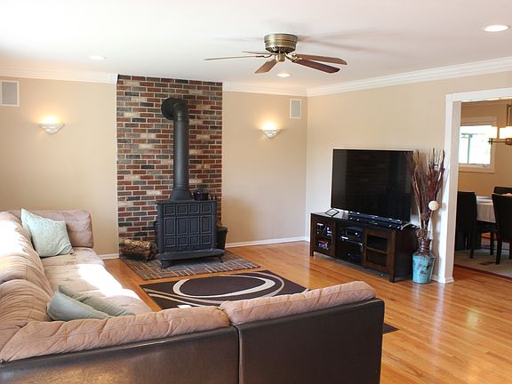 Expanded Cape Cod great for entertaining, with a spacious open floor plan in the kitchen and dining area with stainless steel appliances, granite counter tops in the kitchen with french doors to walk out to the large deck area with built in benches and planters with a hot tub, walk down to the brick patio with a gazebo, indoor/outdoor built in speaker system, updated bathrooms, finished basement with a family room & separate play room or office, lots of storage in a crawl space, storage under stair case & in utility room, attic storage over garage, crown molding, hardwood floors, tile floor and carpet, six panel doors, newly painted rooms, recessed lights, ceiling fans, wood burning stove in living room, semi private wooded back yard setting, playground set REPLACED AND/OR UPDATED *expanded and updated upstairs bathroom *finished basement *tile in kitchen and bathrooms *carpet on both staircases *french doors off of dining area *front entry way & steps *windows *rebuilt deck with planters, benches and hot tub *furnace and AC unit *hot water heater *brand new radon ventilation system *driveway *roof *garage door
