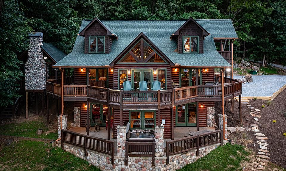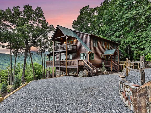 Discover the ultimate mountain retreat in the highly sought-after Aska Adventure Area of Blue Ridge, GA. This stunning log cabin blends luxury, comfort, and breathtaking natural beauty, offering jaw-dropping long-range mountain views from every level. Step inside to a warm and inviting wood-lined interior, anchored by a striking stone fireplace that sets the tone for cozy mountain living. The spacious kitchen is ideal for entertaining, featuring granite countertops, abundant cabinetry, a generous breakfast bar, and a large dining area with plenty of seating for everyone. The master suite is a true escape—complete with its own private balcony overlooking the mountains and a relaxing en-suite bath. With 3 additional oversized bedrooms and 3.5 bathrooms, this cabin provides ample space for family and guests. The finished basement offers even more room to unwind with a second living area, another stone fireplace, a dedicated rec room perfect for pool and games, plus a convenient bar area for entertaining. Outdoor living is where this property truly shines. Enjoy double-decker porches, including a party porch with fireplace, the master balcony, and a newly installed fire pit area surrounded by stone steps and lush landscaping—an ideal spot to take in the serene mountain backdrop. The exterior boasts authentic log construction blended with beautiful stone accents, creating timeless curb appeal. Turn-key and meticulously maintained, this cabin has an impressive rental history, yet is equally suited as a second home or full-time mountain residence. Experience the very best of Blue Ridge living in this exceptional Aska Adventure Area retreat!